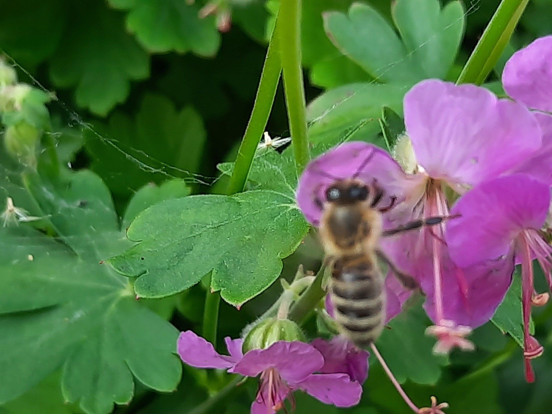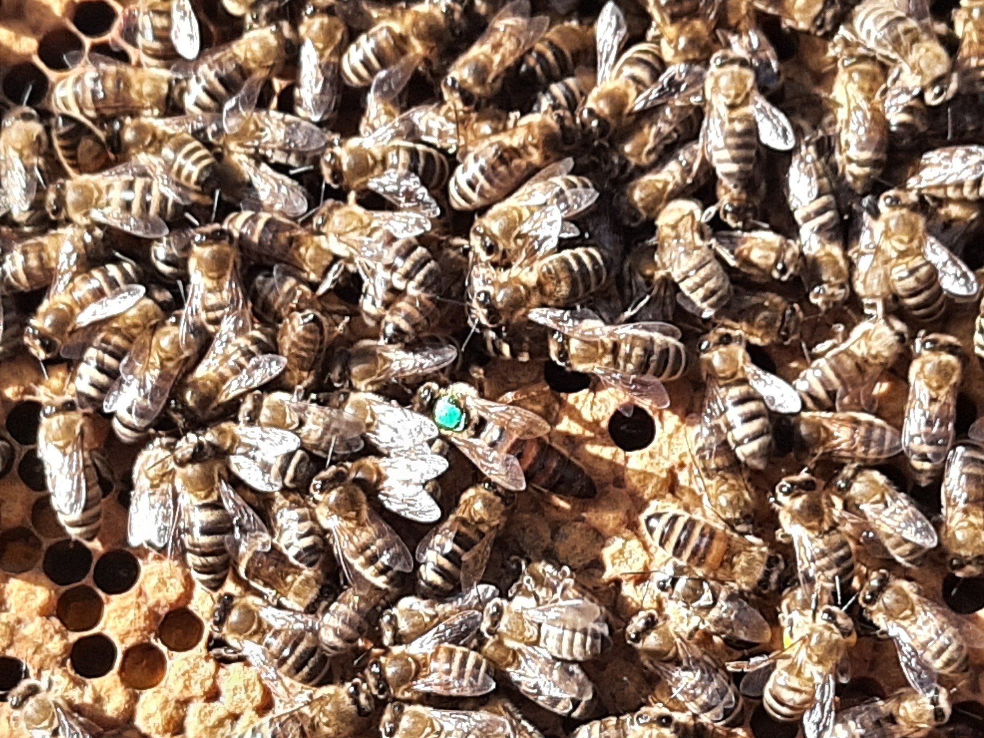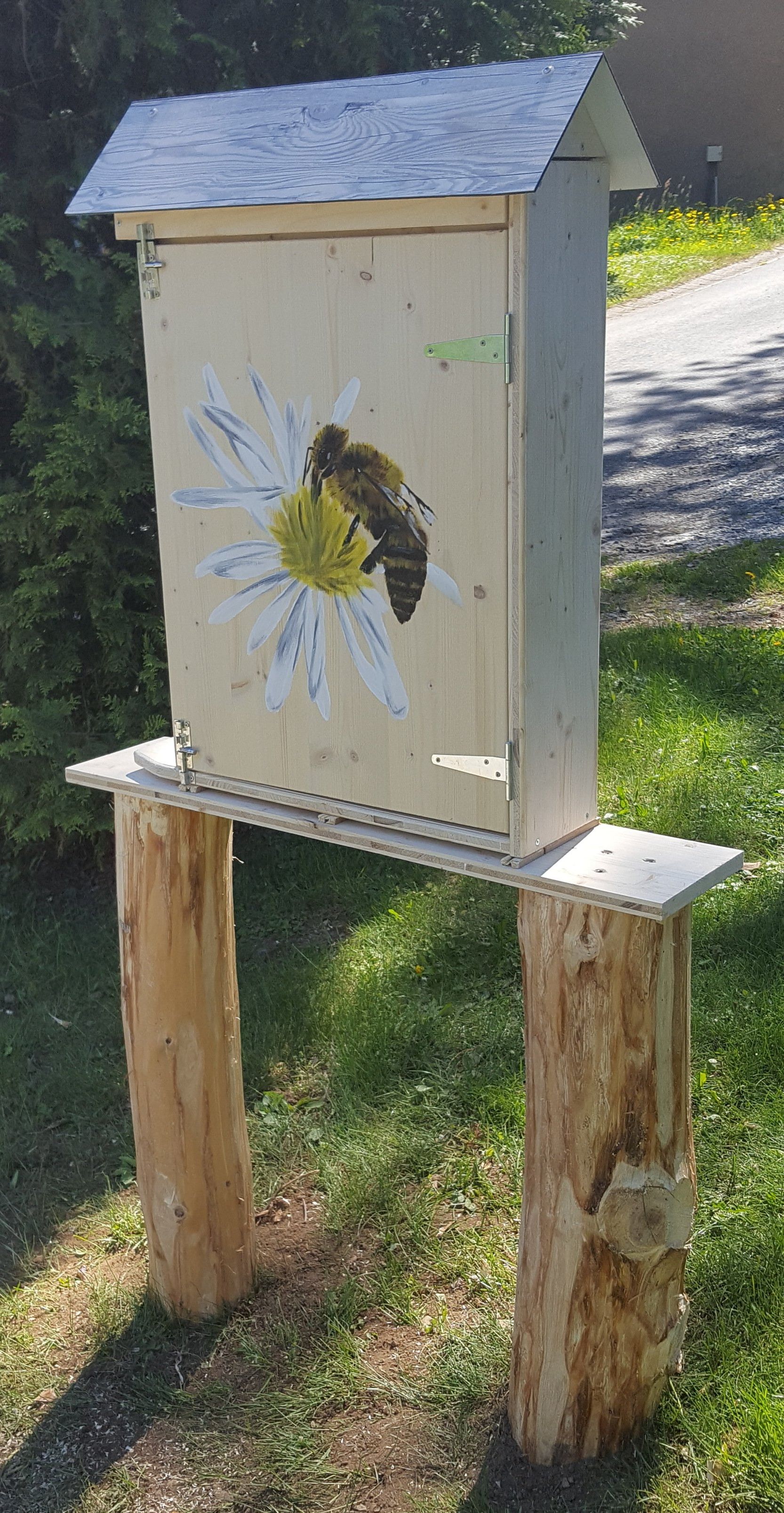 Dieser kann jederzeit geöffnet werden und zeigt das Innenleben eines Bienenstocks hinter Glas.